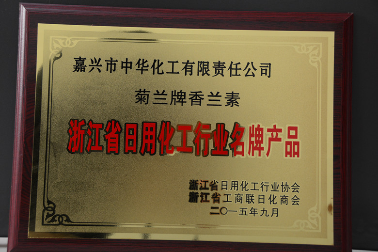 2015年12月4日,浙江省日化行業(yè)協(xié)會五屆六次理事會在浙江鐵道大廈順利召開。會上對浙江省日化行業(yè)名牌產(chǎn)品進(jìn)行了頒獎,我公司生產(chǎn)的“菊蘭”牌香蘭素、乙基香蘭素榮獲浙江省日化行業(yè)名牌產(chǎn)品。公司注冊商標(biāo)“久珠”現(xiàn)為中國馳名商標(biāo)、浙江省著名商標(biāo)和浙江省出口名牌,“久珠”牌香蘭素、乙基香蘭素為浙江省名牌產(chǎn)品。相信“久珠”和“菊蘭”的珠聯(lián)璧合,一定能將中華化工的香蘭素事業(yè)做得更大更強(qiáng)。