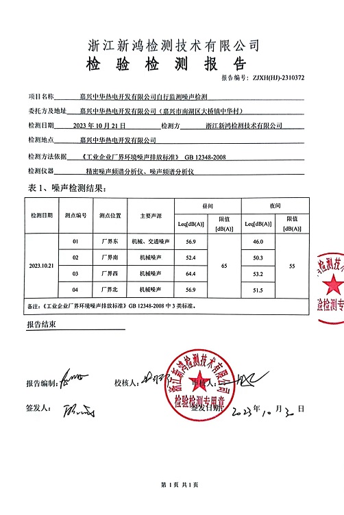 報(bào)告名稱:中華熱電2023年4季度噪聲檢測報(bào)告